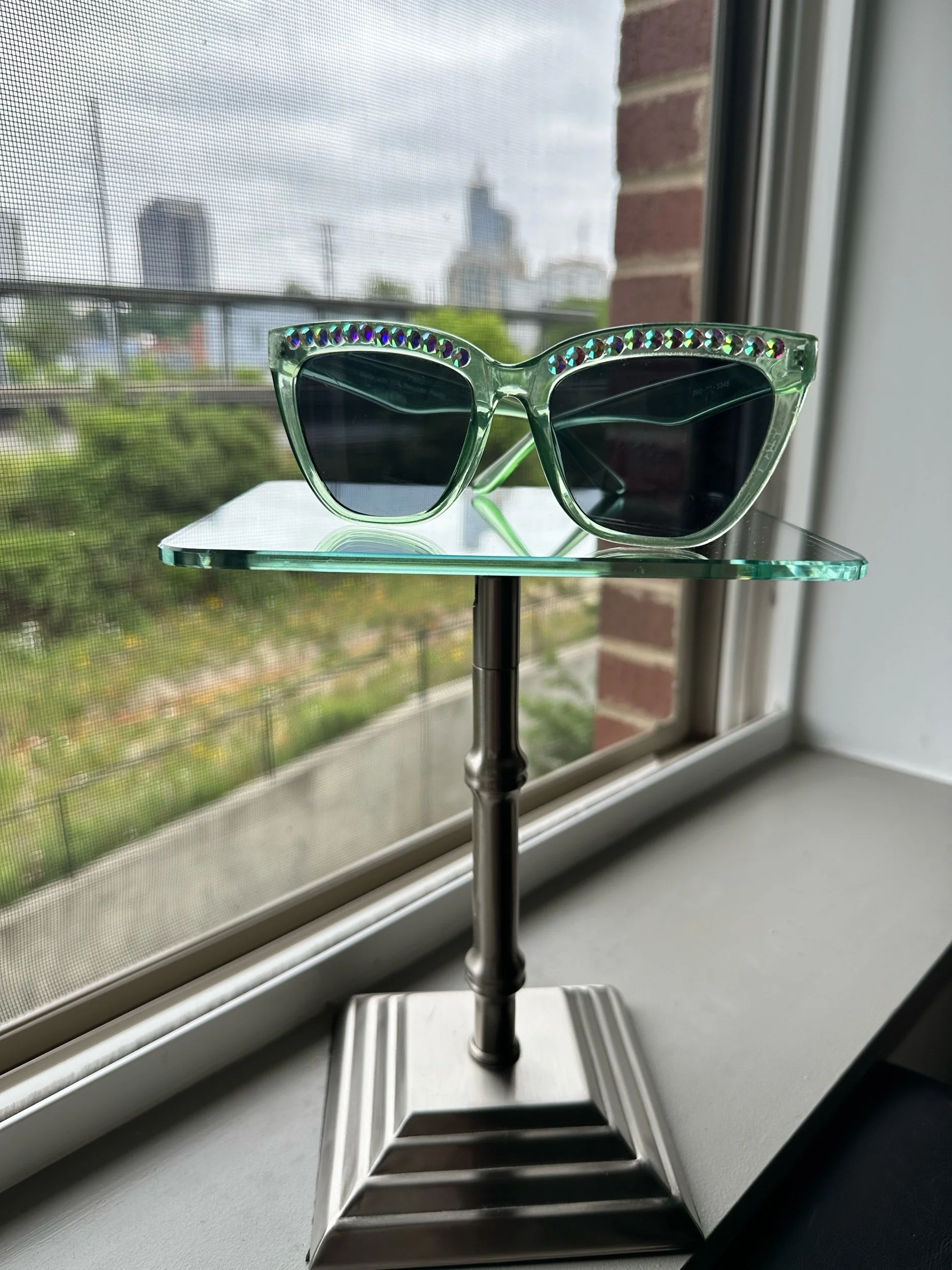 Shop › Lime Sunnies Image 1 of 2 Image 2 of 2 Lime Sunnies Sale Price: $12.00 Original Price: $16.00 Upcycled frames (slight scratching visible) Curated rhinestone decoration Add To Cart Added! Upcycled frames (slight scratching visible) Curated rhinestone decoration